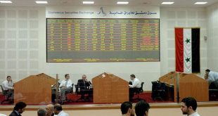 دمشق-سانا أغلقت جلسة تداولات سوق دمشق للأوراق المالية اليوم على حجم تداول قدره 16567 سهماً موزعة على 31 صفقة بقيمة تداولات إجمالية بلغت 963ر2 مليون ليرة وانخفض مؤشر السوق 10ر8 نقاط عن الجلسة الماضية وبنسبة تغير سالبة قدرها 53ر0 بالمئة …