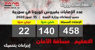 دمشق-سانا أعلنت وزارة الصحة اليوم تسجيل 19 إصابة بفيروس كورونا وشفاء حالتين ووفاة حالة من الإصابات المسجلة بفيروس كورونا في سورية. وأشارت الوزارة في بيان تلقت سانا نسخة منه اليوم إلى أن عدد الإصابات المسجلة في سورية حتى الآن بلغ …