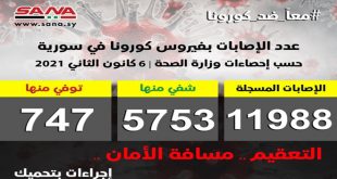دمشق-سانا أعلنت وزارة الصحة اليوم تسجيل 98 إصابة جديدة بفيروس كورونا في سورية وشفاء 67 حالة ووفاة 6 من الإصابات المسجلة بالفيروس. وأوضحت الوزارة في بيان تلقت سانا نسخة منه أن حصيلة الإصابات المسجلة في سورية بلغت حتى الآن 11988 …