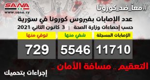 دمشق-سانا أعلنت وزارة الصحة اليوم تسجيل 94 إصابة جديدة بفيروس كورونا في سورية وشفاء 61 حالة ووفاة 6 من الإصابات المسجلة بالفيروس. وأوضحت الوزارة في بيان تلقت سانا نسخة منه أن حصيلة الإصابات المسجلة في سورية بلغت حتى الآن 11710 …
