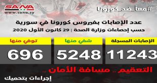 دمشق-سانا أعلنت وزارة الصحة اليوم تسجيل 105 إصابات جديدة بفيروس كورونا في سورية وشفاء 56 حالة ووفاة 10 من الإصابات المسجلة بالفيروس. وأوضحت الوزارة في بيان تلقت سانا نسخة منه أن حصيلة الإصابات المسجلة في سورية بلغت حتى الآن 11243 …
