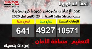 دمشق- سانا أعلنت وزارة الصحة اليوم تسجيل 129 إصابة جديدة بفيروس كورونا في سورية وشفاء 42 حالة ووفاة 11 من الإصابات المسجلة بالفيروس. وأوضحت الوزارة في بيان تلقت سانا نسخة منه أن حصيلة الإصابات المسجلة في سورية بلغت حتى الآن …