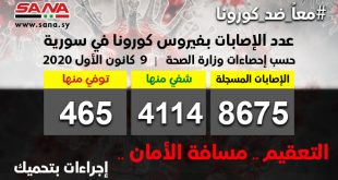 دمشق-سانا أعلنت وزارة الصحة اليوم تسجيل 95 إصابة جديدة بفيروس كورونا وشفاء 55 حالة ووفاة 7 من الإصابات المسجلة بالفيروس في سورية. وأشارت الوزارة في بيان تلقت سانا نسخة منه إلى أن حصيلة الإصابات المسجلة في سورية بلغت حتى الآن …