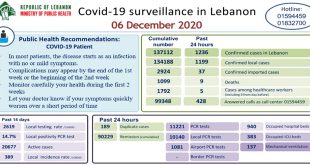 بيروت-سانا أعلنت وزارة الصحة اللبنانية تسجيل 1236 إصابة جديدة بكورونا خلال الساعات الأربع والعشرين الماضية ما يرفع إجمالي الإصابات إلى 137112. وأظهر التقرير اليومي للوزارة تسجيل 9 وفيات جديدة ليصل العدد الإجمالي للوفيات في البلاد إلى 1099. وكانت الوزارة سجلت …