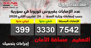 دمشق-سانا أعلنت وزارة الصحة اليوم تسجيل 83 إصابة جديدة بفيروس كورونا وشفاء 59 حالة ووفاة 8 من الإصابات المسجلة بالفيروس في سورية. وأشارت الوزارة في بيان تلقت سانا نسخة منه إلى أن حصيلة الإصابات المسجلة في سورية بلغت حتى الآن …