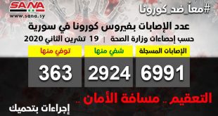 دمشق-سانا أعلنت وزارة الصحة اليوم تسجيل 72 إصابة جديدة بفيروس كورونا وشفاء 56 حالة ووفاة 5 من الإصابات المسجلة بالفيروس في سورية. وأشارت الوزارة في بيان تلقت سانا نسخة منه إلى أن حصيلة الاصابات المسجلة في سورية بلغت حتى الآن …