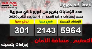 دمشق-سانا أعلنت وزارة الصحة اليوم تسجيل 76 إصابة جديدة بفيروس كورونا وشفاء 43 حالة ووفاة 3 حالات من الإصابات المسجلة بالفيروس في سورية. وأشارت الوزارة في بيان تلقت سانا نسخة منه اليوم إلى أن حصيلة الإصابات المسجلة في سورية حتى …