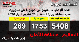 دمشق-سانا أعلنت وزارة الصحة اليوم تسجيل 49 إصابة جديدة بفيروس كورونا وشفاء 31 حالة ووفاة اثنتين من الإصابات المسجلة بالفيروس في سورية. وأشارت الوزارة في بيان تلقت سانا نسخة منه إلى أن حصيلة الإصابات المسجلة في سورية بلغت حتى الآن …