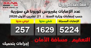 دمشق-سانا أعلنت وزارة الصحة اليوم تسجيل 44 اصابة جديدة بفيروس كورونا وشفاء 33 حالة ووفاة 3 من الإصابات المسجلة بفيروس كورونا في سورية. وأوضحت الوزارة في بيان تلقت سانا نسخة منه أن حصيلة الإصابات المسجلة في سورية حتى الآن بلغت …