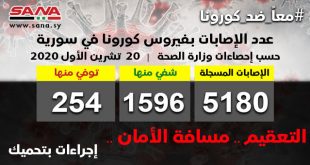 دمشق-سانا أعلنت وزارة الصحة اليوم تسجيل 46 إصابة جديدة بفيروس كورونا وشفاء 31 حالة ووفاة 3 من الإصابات المسجلة بفيروس كورونا في سورية. وأوضحت الوزارة في بيان تلقت سانا نسخة منه أن حصيلة الإصابات المسجلة في سورية بلغت حتى الآن …