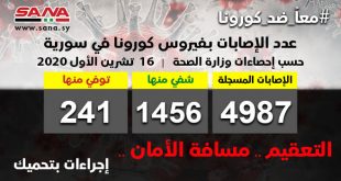 دمشق-سانا أعلنت وزارة الصحة اليوم تسجيل 56 إصابة جديدة بفيروس كورونا وشفاء 31 حالة ووفاة 3 من الإصابات المسجلة بالفيروس في سورية. وأوضحت الوزارة في بيان تلقت سانا نسخة منه أن حصيلة الإصابات المسجلة في سورية بلغت حتى الآن 4987 …