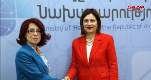 يريفان-سانا بحثت وزيرة الصحة الأرمينية أناهيد افانيسيان مع سفيرة سورية في أرمينيا الدكتورة نورا أريسيان والسكرتير الثالث أحمد العذبه سبل التعاون في القطاع الصحي بين سورية وأرمينيا.