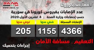 دمشق-سانا أعلنت وزارة الصحة اليوم تسجيل 37 إصابة جديدة بفيروس كورونا وشفاء 12 حالة ووفاة حالة واحدة من الإصابات المسجلة بالفيروس في سورية. وأشارت الوزارة في بيان تلقت سانا نسخة منه اليوم إلى أن عدد الإصابات المسجلة في سورية حتى …