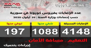 دمشق-سانا أعلنت وزارة الصحة اليوم تسجيل 46 إصابة جديدة بفيروس كورونا وشفاء 14 حالة ووفاة ثلاث حالات من الإصابات المسجلة بالفيروس في سورية. وأشارت الوزارة في بيان تلقت سانا نسخة منه إلى أن حصيلة الإصابات المسجلة بلغت حتى الآن 4148 …