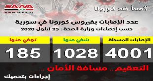 دمشق-سانا أعلنت وزارة الصحة اليوم تسجيل 35 إصابة جديدة وشفاء 15 حالة ووفاة حالتين من الإصابات المسجلة بفيروس كورونا في سورية. وأشارت الوزارة في بيان تلقت سانا نسخة منه اليوم إلى أن حصيلة الإصابات المسجلة في سورية حتى الآن بلغت …