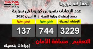 دمشق-سانا أعلنت وزارة الصحة تسجيل 58 إصابة جديدة وشفاء 14 حالة ووفاة 3 حالات من الإصابات المسجلة بفيروس كورونا في سورية. وأشارت الوزارة في بيان تلقت سانا نسخة منه إلى أن حصيلة الإصابات المسجلة في سورية حتى الآن بلغت 3229 …