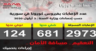 دمشق-سانا أعلنت وزارة الصحة اليوم تسجيل 75 إصابة جديدة بفيروس كورونا وشفاء 20 حالة ووفاة 4 من الإصابات المسجلة بالفيروس في سورية. وأشارت الوزارة في بيان تلقت سانا نسخة منه اليوم إلى أن حصيلة الإصابات المسجلة في سورية حتى الآن …