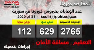 دمشق-سانا أعلنت وزارة الصحة اليوم تسجيل 62 إصابة جديدة بفيروس كورونا وشفاء 15 حالة ووفاة 3 حالات من الإصابات المسجلة بالفيروس في سورية. وأشارت الوزارة في بيان تلقت سانا نسخة منه اليوم إلى أن حصيلة الإصابات المسجلة في سورية حتى …