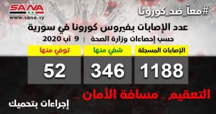 دمشق-سانا أعلنت وزارة الصحة اليوم تسجيل 63 إصابة جديدة بفيروس كورونا وشفاء 15 حالة ووفاة اثنتين من الإصابات المسجلة في سورية. وأشارت الوزارة في بيان تلقت سانا نسخة منه اليوم إلى أن حصيلة الإصابات المسجلة في سورية حتى الآن بلغت …