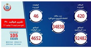 القاهرة-سانا سجلت وزارة الصحة المصرية 420 إصابة جديدة و46 وفاة بفيروس كورونا المستجد خلال الساعات الأربع والعشرين الماضية. وقال الدكتور خالد مجاهد المتحدث باسم الوزارة في بيان اليوم إنه تم تسجيل 420 إصابة جديدة و46 حالة وفاة بفيروس كورونا خلال …