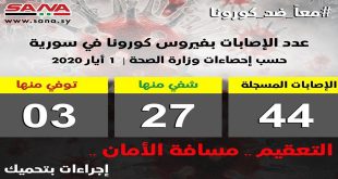 دمشق-سانا أعلنت وزارة الصحة اليوم شفاء 6 حالات من الإصابات المسجلة بفيروس كورونا وتسجيل إصابة جديدة. وقالت الوزارة في بيان لها تلقت سانا نسخة منه اليوم إنه تم شفاء ست حالات من الإصابات المسجلة بالفيروس ليرتفع عدد حالات الشفاء إلى …