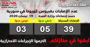 دمشق-سانا أعلنت وزارة الصحة اليوم عن تسجيل إصابة جديدة بفيروس كورونا ليرتفع عدد الإصابات المسجلة في سورية إلى 39 إصابة مشيرة إلى تسجيل حالة وفاة جديدة من الإصابات المسجلة سابقاً. وأوضحت الوزارة في بيان تلقت سانا نسخة منه أنه تم …