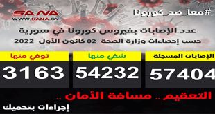 دمشق-سانا أعلنت وزارة الصحة تسجيل 4 إصابات جديدة بفيروس كورونا في سورية وشفاء حالتين دون تسجيل أي حالة وفاة. وأوضحت الوزارة في بيان تلقت سانا نسخة منه اليوم أن عدد الإصابات المسجلة في سورية بلغ حتى الآن 57404 شفيت منها …