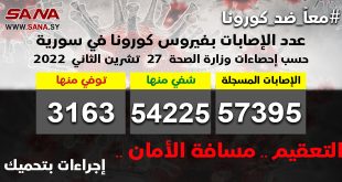 دمشق-سانا أعلنت وزارة الصحة تسجيل إصابة واحدة بفيروس كورونا في سورية وشفاء حالة دون تسجيل أي حالة وفاة.