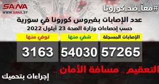 دمشق-سانا أعلنت وزارة الصحة اليوم تسجيل 8 إصابات جديدة بفيروس كورونا في سورية وشفاء 10 حالات من الإصابات