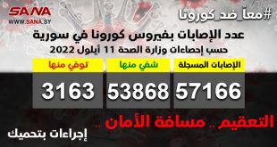 دمشق-سانا أعلنت وزارة الصحة اليوم تسجيل 8 إصابات جديدة بفيروس كورونا في سورية وشفاء 49 حالة دون تسجيل أي وفاة جديدة