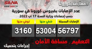دمشق-سانا أعلنت وزارة الصحة اليوم تسجيل 16 إصابة جديدة بفيروس كورونا في سورية وشفاء 20 حالة من الإصابات المسجلة