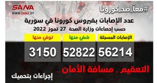 دمشق-سانا أعلنت وزارة الصحة اليوم تسجيل 26 إصابة جديدة بفيروس كورونا في سورية وشفاء 5 حالات من الإصابات المسجلة بالفيروس