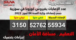 دمشق- سانا أعلنت وزارة الصحة اليوم تسجيل إصابتين جديدتين بفيروس كورونا في سورية وشفاء حالة واحدة من الإصابات المسجلة بالفيروس. وأوضحت الوزارة في بيان تلقت سانا نسخة منه أن عدد الإصابات المسجلة في سورية بلغ حتى الآن 55934 شفي منها …
