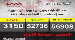 دمشق-سانا أعلنت وزارة الصحة اليوم تسجيل إصابة واحدة جديدة بفيروس كورونا في سورية وشفاء 3 حالات من الإصابات المسجلة بالفيروس. وأوضحت الوزارة في بيان تلقت سانا نسخة منه أن عدد الإصابات المسجلة في سورية بلغ حتى الآن 55908 شفي منها …