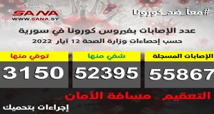 دمشق-سانا أعلنت وزارة الصحة اليوم تسجيل إصابة واحدة جديدة بفيروس كورونا في سورية وشفاء 52 حالة من الاصابات المسجلة بالفيروس0 وأوضحت الوزارة فى بيان تلقت سانا نسخة منه أن عدد الاصابات المسجلة في سورية بلغ حتى الآن 55868 شفيت منها …