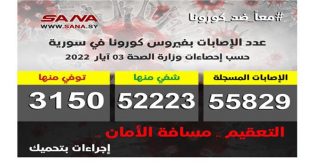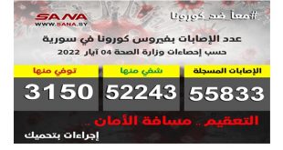 دمشق-سانا أعلنت وزارة الصحة اليوم تسجيل 4 إصابات جديدة بفيروس كورونا في سورية وشفاء 22 حالة من الإصابات المسجلة بالفيروس