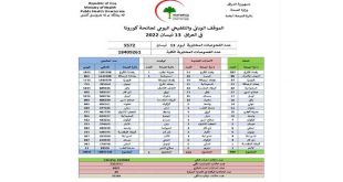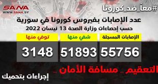 دمشق-سانا أعلنت وزارة الصحة اليوم تسجيل 6 إصابات جديدة بفيروس كورونا في سورية وشفاء 14 حالة ووفاة حالة واحدة