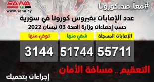 دمشق-سانا أعلنت وزارة الصحة اليوم تسجيل 5 إصابات جديدة بفيروس كورونا في سورية وشفاء 31 حالة