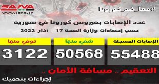 دمشق-سانا أعلنت وزارة الصحة اليوم تسجيل 28 إصابة جديدة بفيروس كورونا في سورية وشفاء 216 ووفاة حالتين من الإصابات المسجلة بالفيروس