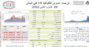بيروت-سانا سجل لبنان 15 وفاة و7726 إصابة جديدة بفيروس كورونا خلال الساعات الأربع والعشرين الماضية.