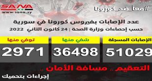 دمشق-سانا أعلنت وزارة الصحة اليوم تسجيل 44 إصابة جديدة بفيروس كورونا في سورية وشفاء 295 حالة ووفاة 3 حالات