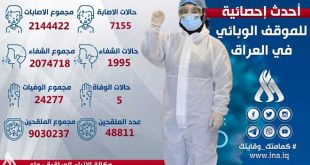بغداد-سانا سجل العراق 5 وفيات و7155 إصابة جديدة بفيروس كورونا خلال الساعات الأربع والعشرين الماضية.