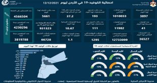 عمان-سانا سجلت الأردن 41 وفاة و3897 إصابة جديدة بفيروس كورونا خلال الساعات الأربع والعشرين الماضية. وذكرت وزارة الصحة الأردنية في تقريرها اليومي أن إجمالي الإصابات بلغ 1010033 والوفيات 11982 والمتماثلين للشفاء 931323 شخصاً. وسجل الأردن أمس 24 وفاة و2708 إصابات …