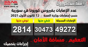 دمشق- سانا أعلنت وزارة الصحة اليوم تسجيل 83 إصابة جديدة بفيروس كورونا في سورية وشفاء 97 حالة ووفاة 5 حالات من الإصابات المسجلة بالفيروس . وأوضحت الوزارة في بيان تلقت سانا نسخة منه أن عدد الإصابات المسجلة في سورية بلغ …