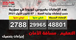 دمشق-سانا أعلنت وزارة الصحة اليوم تسجيل 92 إصابة جديدة بفيروس كورونا في سورية وشفاء 115 حالة ووفاة 6 حالات من الإصابات المسجلة بالفيروس. وأوضحت الوزارة في بيان تلقت سانا نسخة منه أن عدد الإصابات المسجلة في سورية بلغ حتى الآن …