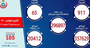 القاهرة-سانا سجلت وزارة الصحة والسكان المصرية 65 حالة وفاة و911 إصابة جديدة بفيروس كورونا خلال الساعات الأربع والعشرين الماضية. وأوضح المتحدث باسم الوزارة الدكتور حسام عبد الغفار فى بيان أن إجمالي الإصابات بفيروس كورونا في البلاد وصل لغاية الآن إلى …