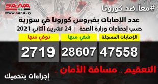 دمشق-سانا أعلنت وزارة الصحة اليوم تسجيل 110 إصابات جديدة بفيروس كورونا في سورية وشفاء 90 حالة ووفاة 5 حالات من الإصابات المسجلة بالفيروس. وأوضحت الوزارة في بيان تلقت سانا نسخة منه أن عدد الإصابات المسجلة في سورية بلغ حتى الآن …