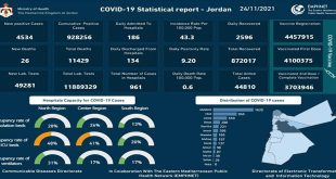 عمان-سانا سجل الأردن 26 وفاة و4534 إصابة جديدة بفيروس كورونا خلال الساعات الأربع والعشرين الماضية. وذكرت وزارة الصحة في بيان أن إجمالي الإصابات الناجمة عن الفيروس في البلاد ارتفع إلى 928256 والوفيات إلى 11429 والمتعافين إلى 872017 شخصاً. وكان الأردن …