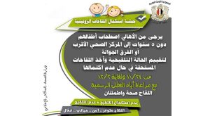 دمشق-سانا تطلق وزارة الصحة الأربعاء القادم حملة استكمال اللقاحات الروتينية لمتابعة الأطفال المتسربين وتستمر حتى الـ 2 من كانون الأول القادم باستثناء أيام العطل الرسمية وتشمل الأطفال من عمر يوم حتى خمس سنوات. وتستهدف الحملة نحو 8ر2 مليون طفل في …