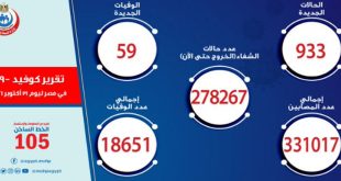 مصر تسجل 59 حالة وفاة و 933 إصابة جديدة بفيروس كورونا